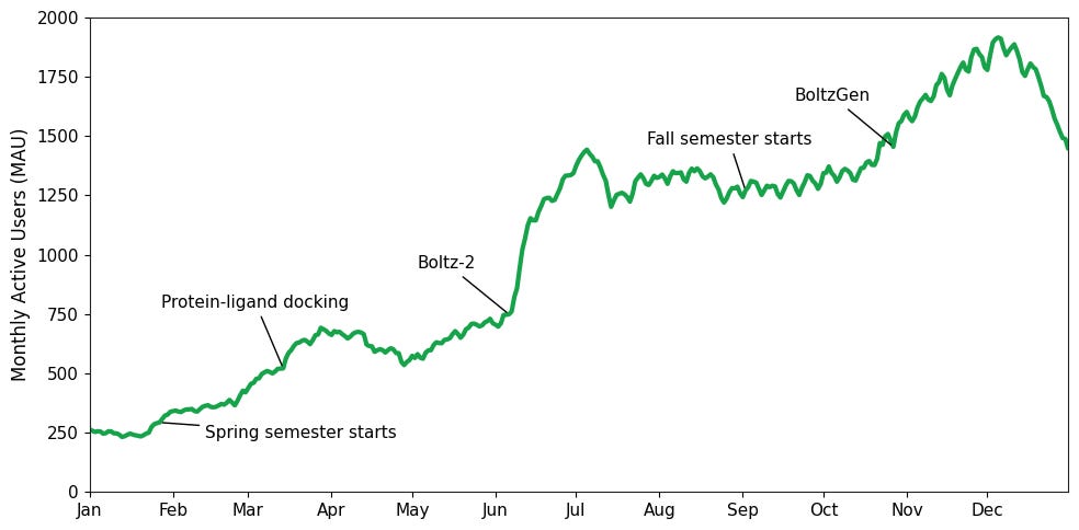 Of course, none of these features matter if scientists aren’t using them—and we’ve been happy to see significantly increased usage on Rowan this year. We now have over 8000 users; monthly active users have increased over 7x from last year, and the number of calculations run is up 19x.