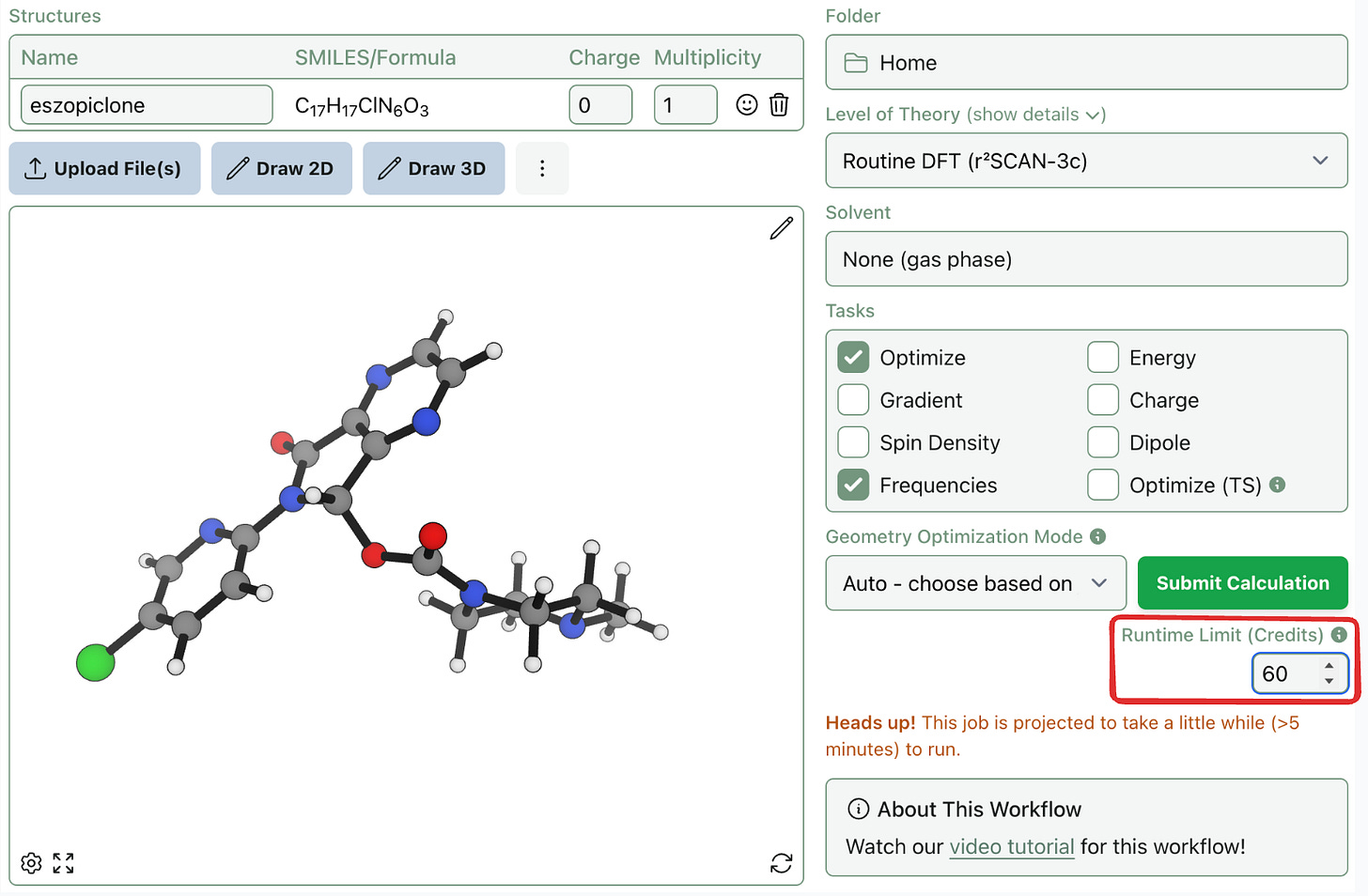 When submitting a workflow, you can now set a maximum runtime in credits (1 credit = 1 minute). If a job exceeds that limit, it will automatically stop. This limit can be updated or removed after a job is submitted. Due to the stateful nature of scientific software, jobs can't be resumed exactly—but optimizations can be resubmitted from the last saved structure, which is almost always lower in energy than your starting point.