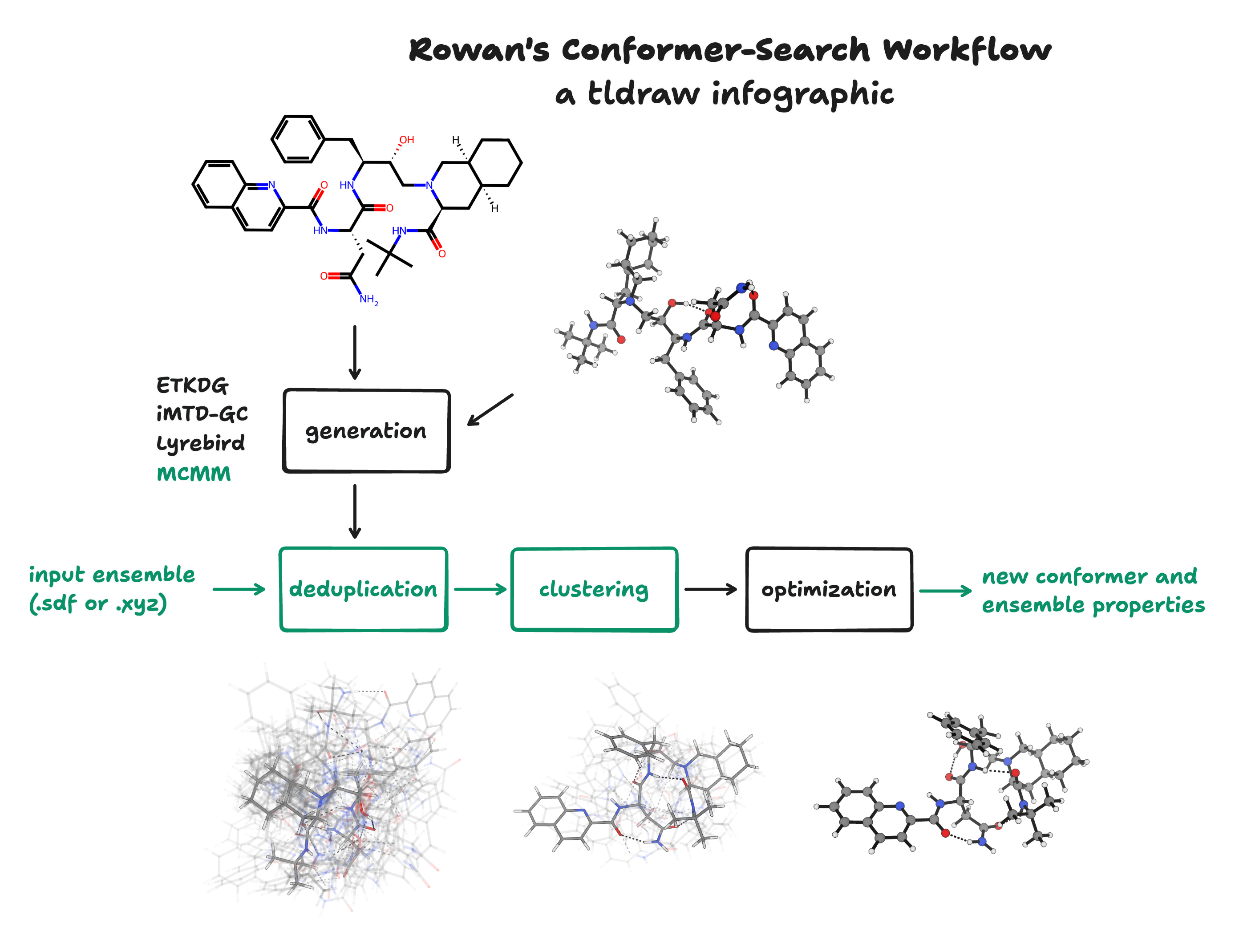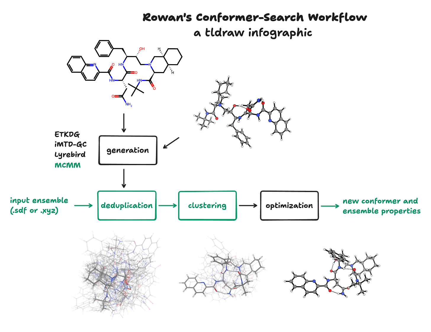 Today, we’re excited to share a wide variety of updates that significantly increase the modularity, efficiency, and robustness of Rowan’s conformer-search workflow. These updates affect virtually every aspect of the workflow; the following infographic shows what happens during Rowan’s conformer-search workflow, with all the new additions shown in green.