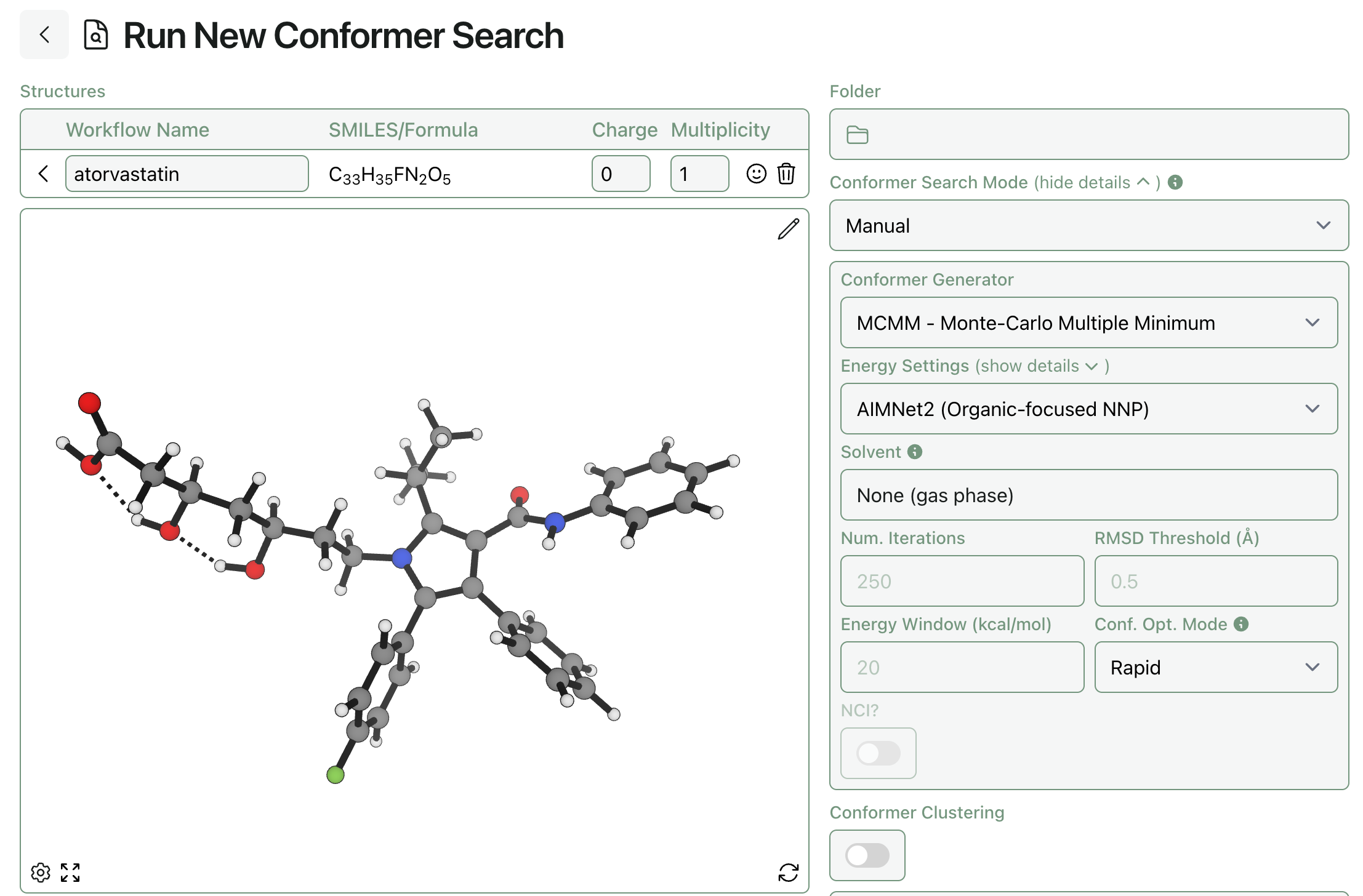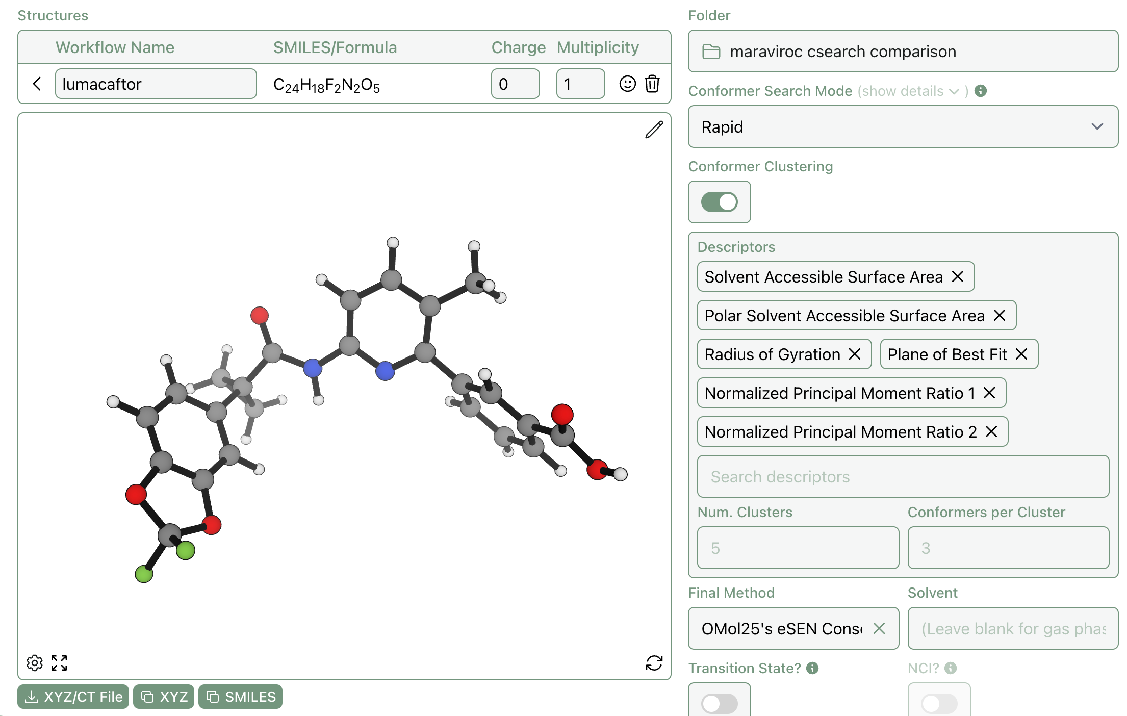 For large and flexible molecules, adding this clustering step significantly increases the speed of the workflow while still providing a diverse and representative set of output conformers. Conformer clustering is off in Rowan by default, but consider enabling it if you’re looking to generate diverse conformer ensembles in a cost-efficient manner!
