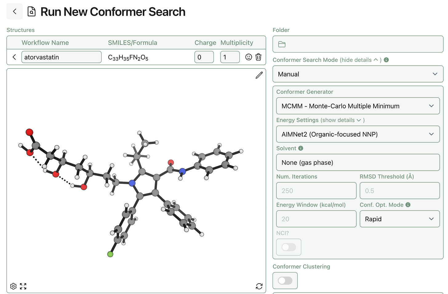We’ve added support for Nick’s conformer-generation method (which we’re calling MCMM) in Rowan’s conformer-search workflow. Unlike CREST, which only works with xTB methods, you can use any level of theory with MCMM—and you can tune the number of samples, the energy window, and more through Rowan’s interface.
