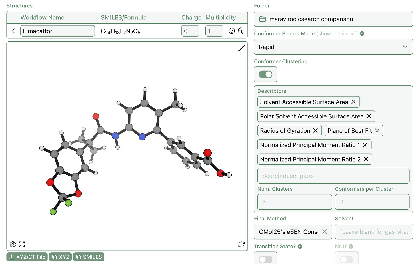 Rowan’s conformer-clustering workflow uses a variety of three-dimensional descriptors to cluster conformers before selecting a user-tunable number of conformers per cluster. By default, Rowan groups conformers into 5 clusters and selects the lowest 3 conformers from each cluster, but this can easily be tuned. (Increasing the number of clusters ensures that more diverse conformers are obtained, while increasing the number of compounds per cluster increases the amount of conformers obtained for each region of conformer space.)