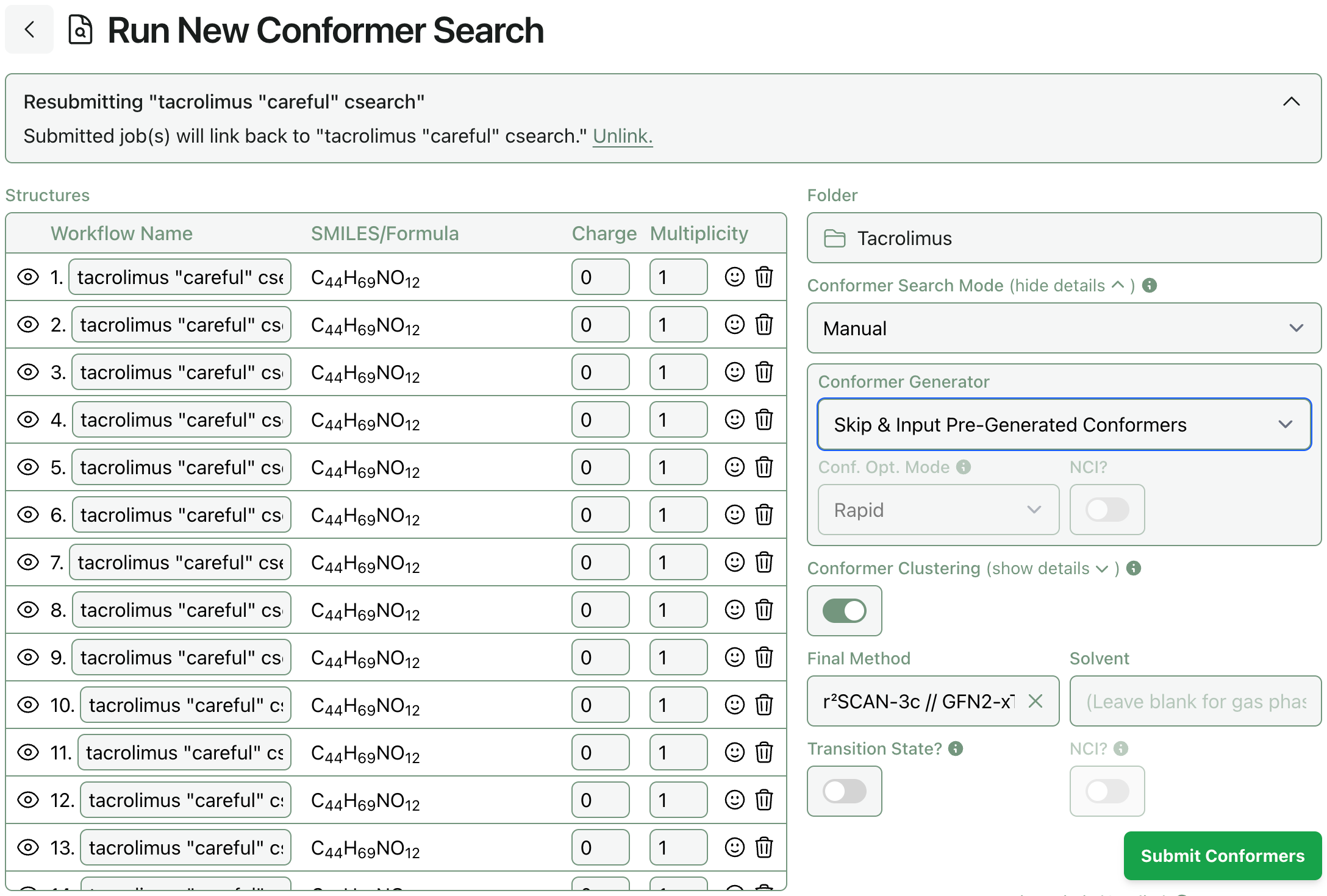 To submit an ensemble of pre-generated conformers to Rowan’s conformer-search workflow, select conformer-search mode “Manual” and set the conformer generator to “skip.” All the input structures will be submitted to a single conformer-search workflow that will start from the deduplication step.