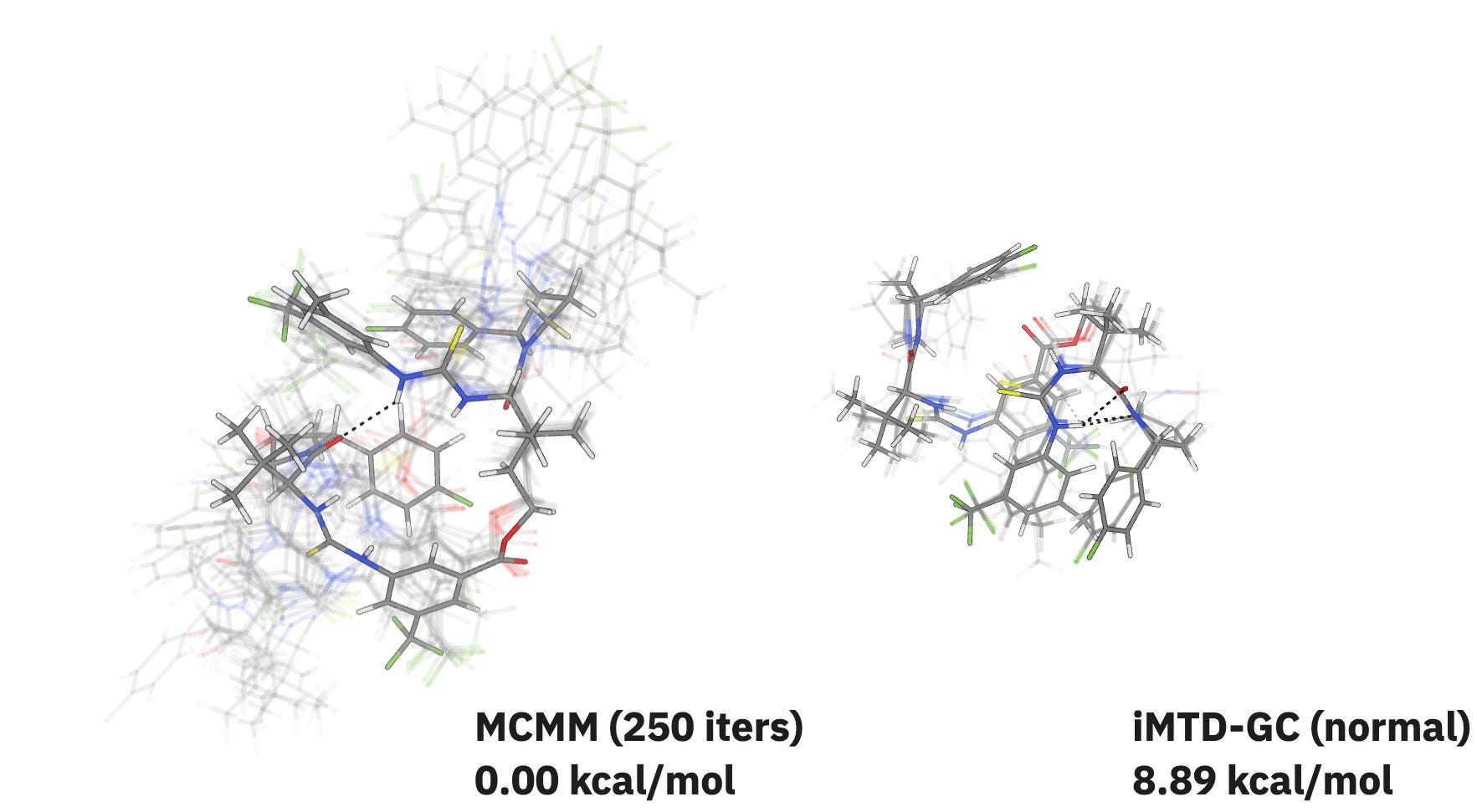 In our initial testing, MCMM performs similarly to iMTD-GC for small and medium-sized systems but starts to dramatically outperform iMTD-GC for very large molecules. For the “Naomi dimer” catalyst reported by Kennedy and co-workers, MCMM explores a much bigger region of conformer space than iMTD-GC while finding a significantly lower-energy structure: