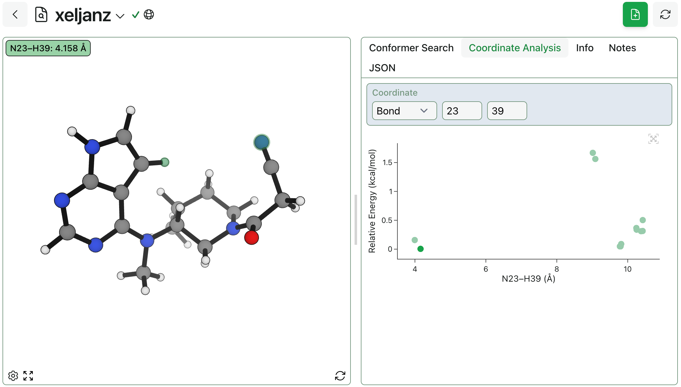 To plot relative energy vs. a bond, angle, or dihedral value, click into the “Coordinate” box and select atoms using the interactive 3D viewer (or enter atom indices). You can also click on the scatterplot’s points to change the view to the corresponding structure.