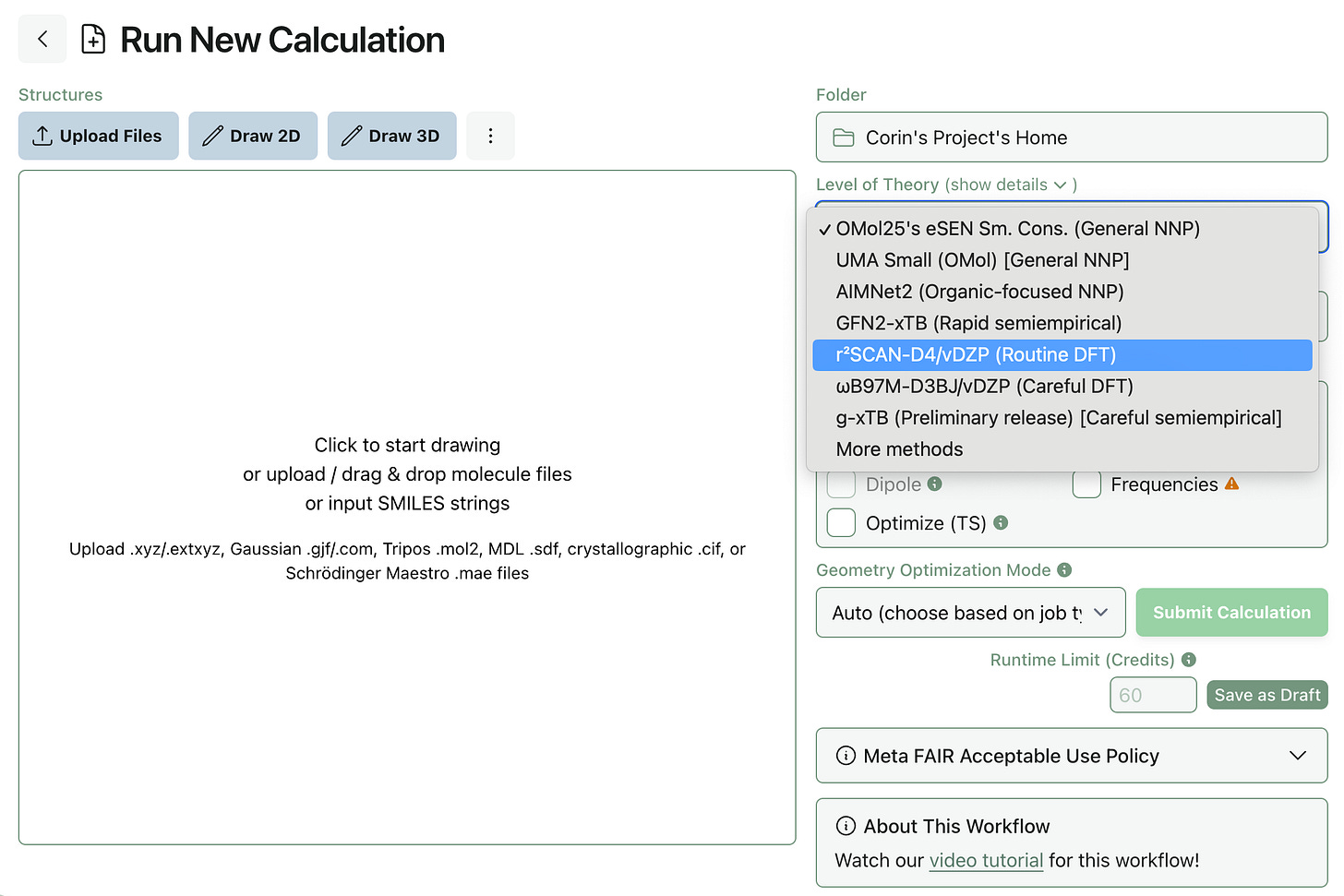For full control, you can click “Show Details” to individually modify the functional, basis set, corrections, and choice of DFT engine. Different methods are supported by different engines; while the “3c” methods are not yet available in PySCF or GPU4PySCF, most other functionals and basis sets are available.