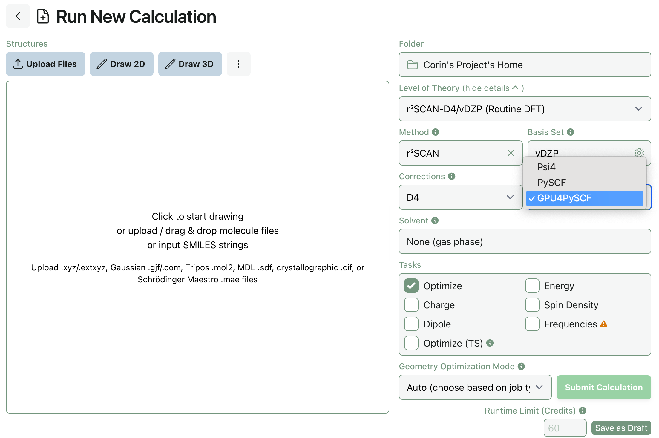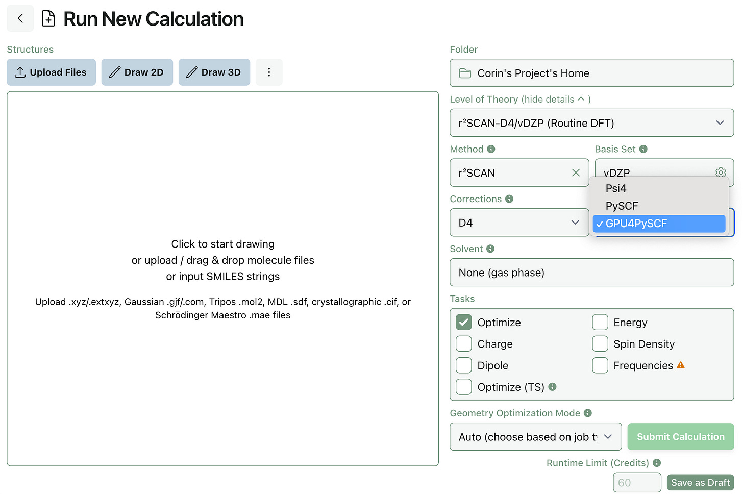 It’s easy to submit GPU4PySCF calculations through Rowan. We’ve updated the default DFT methods—now, our suggested “routine” and “careful” DFT methods both run through GPU4PySCF.