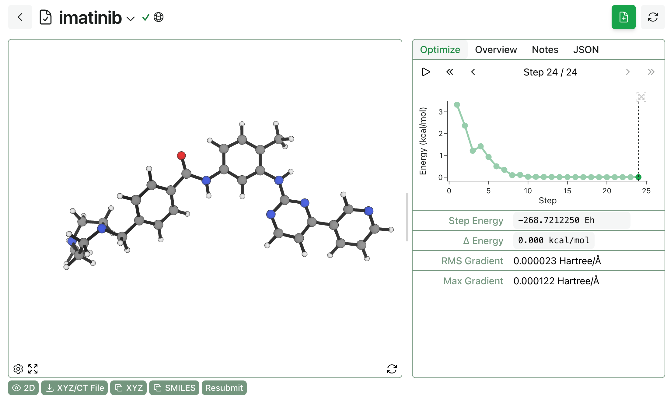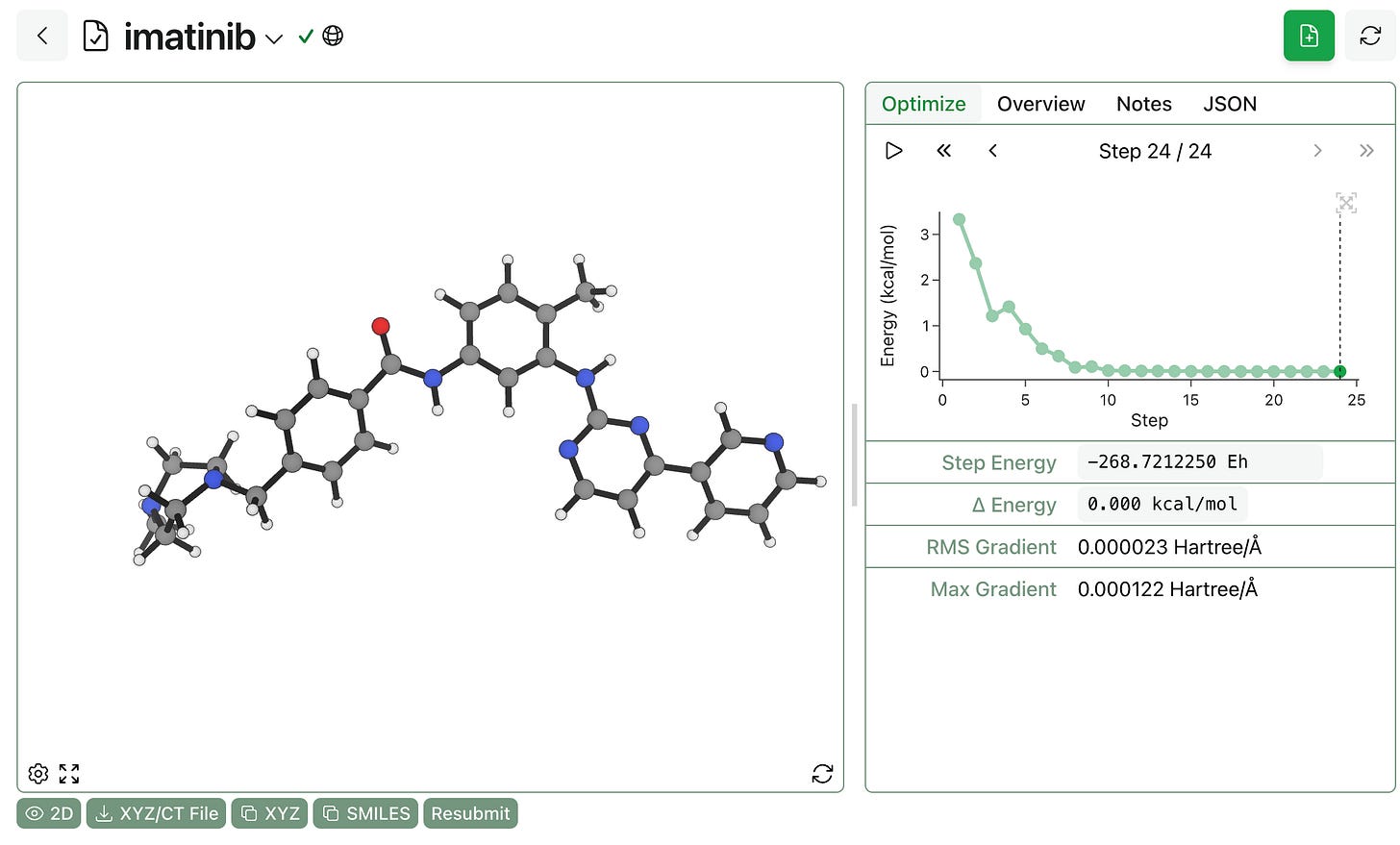 Once submitted, calculations run through GPU4PySCF can be monitored, analyzed, and resubmitted just like any other calculation run through Rowan. The main different is speed—for instance, this imatinib calculation takes only 30 seconds per optimization step at the r2SCAN-D4/vDZP level of theory.