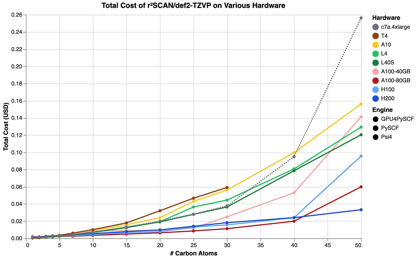 In practice, GPU4PySCF is much faster than Psi4 or PySCF, often by more than an order of magnitude. We are excited for the possibilities offered by GPU4PySCF and wrote a deeper technical blog for those who are interested, going into the performance across various functionals, basis sets, GPUs, and systems (sneak peek: GPU4PySCF offers even greater speedups for larger basis sets and range-separated hybrids). Even though GPUs are more expensive per hour than CPUs, GPU4PySCF is so fast that it’s cheaper to run than Psi4 or PySCF:
