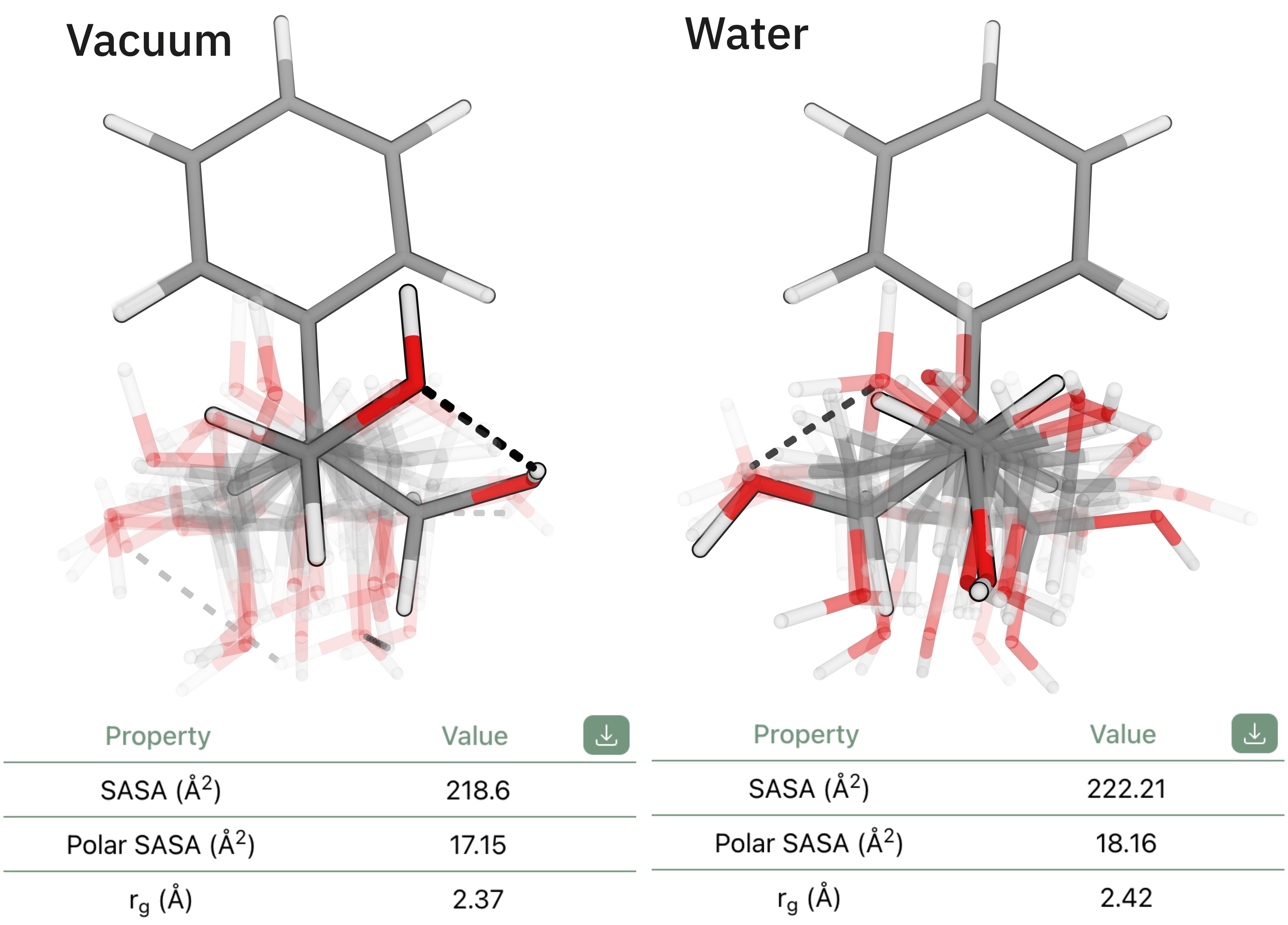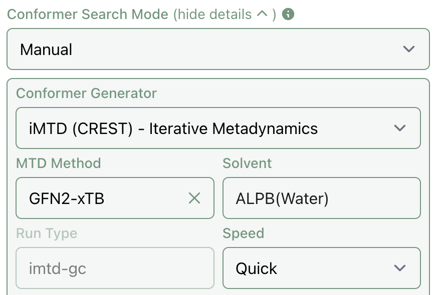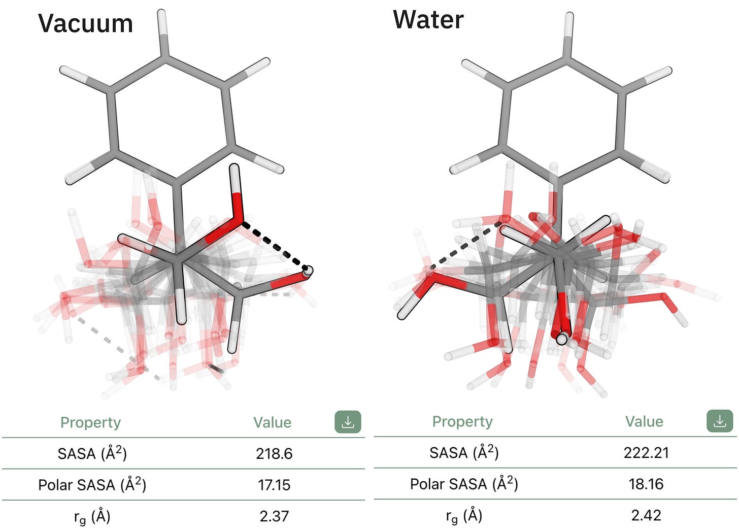 We’ve been putting a lot of attention into our conformer search protocols recently, and one trailing feature we’re happy to announce is the ability to run a CREST conformer search in solvent. This enables more realistic conformer ensembles for molecules where solvation significantly alters relative energies.