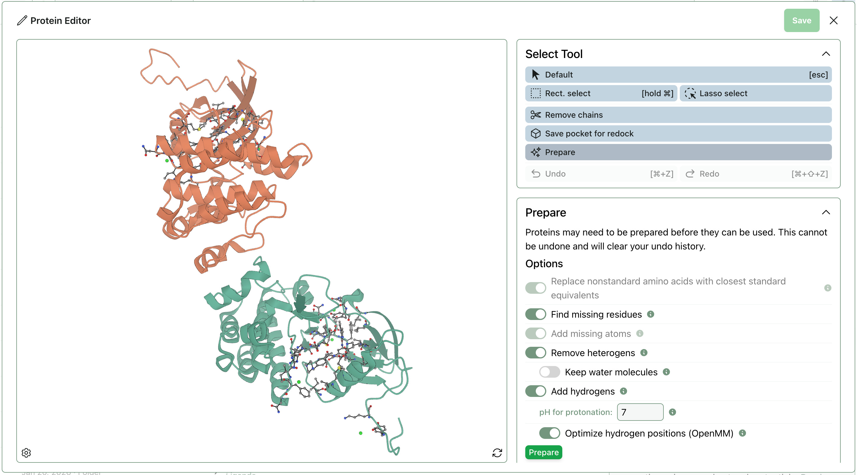 Any errors or warnings can be addressed using the improved “Prepare” tool in the protein editor, which now exposes a series of controls that let you choose: