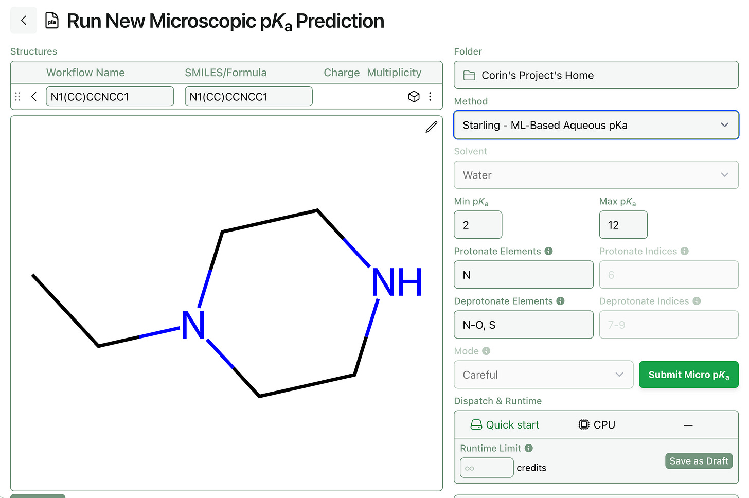 To run microscopic pKa predictions using Starling, select the “Starling” method on the microscopic pKa prediction page.