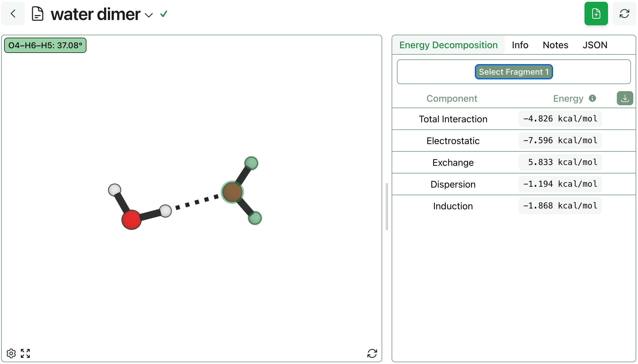 For the simple water dimer we obtain a total interaction energy of –4.8 kcal/mol with SAPT0/jun-cc-pVDZ (negative indicates attraction). We can break this down: