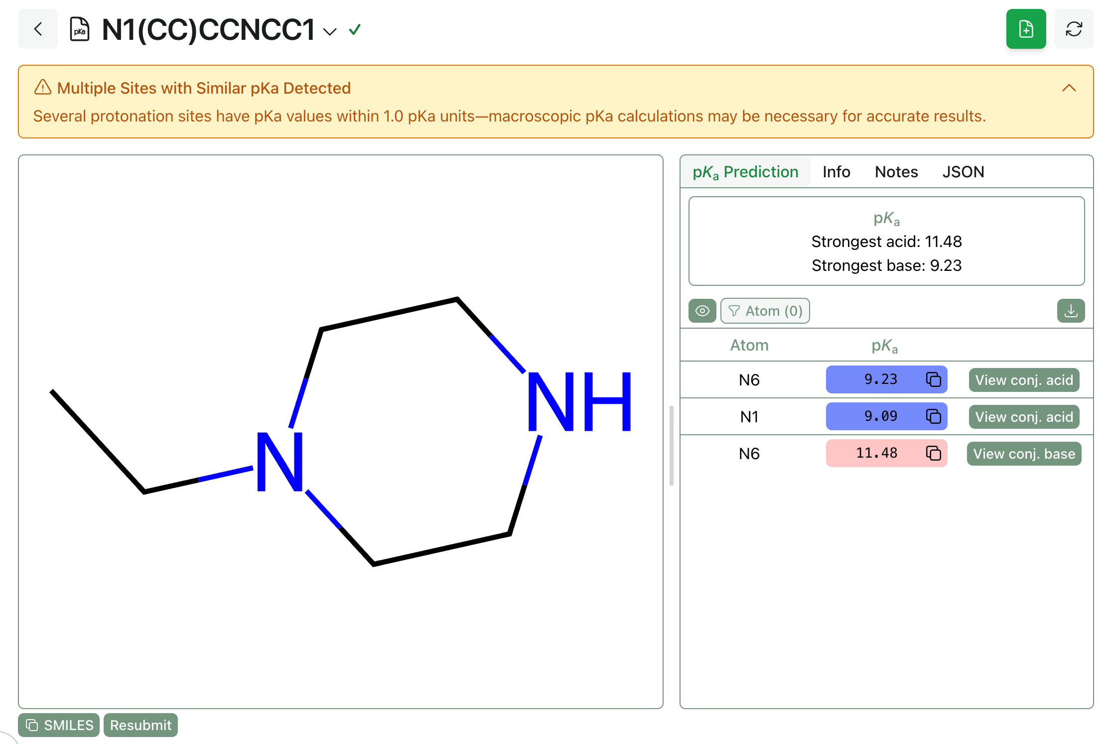 This job completed in under 30 seconds and the results can be quickly visualized in Rowan’s GUI. The same checks we run on all pKa predictions will be applied to microscopic pKa predictions run with Starling; here, the workflow warns that there are multiple sites with similar pKa values, which is indeed the case.