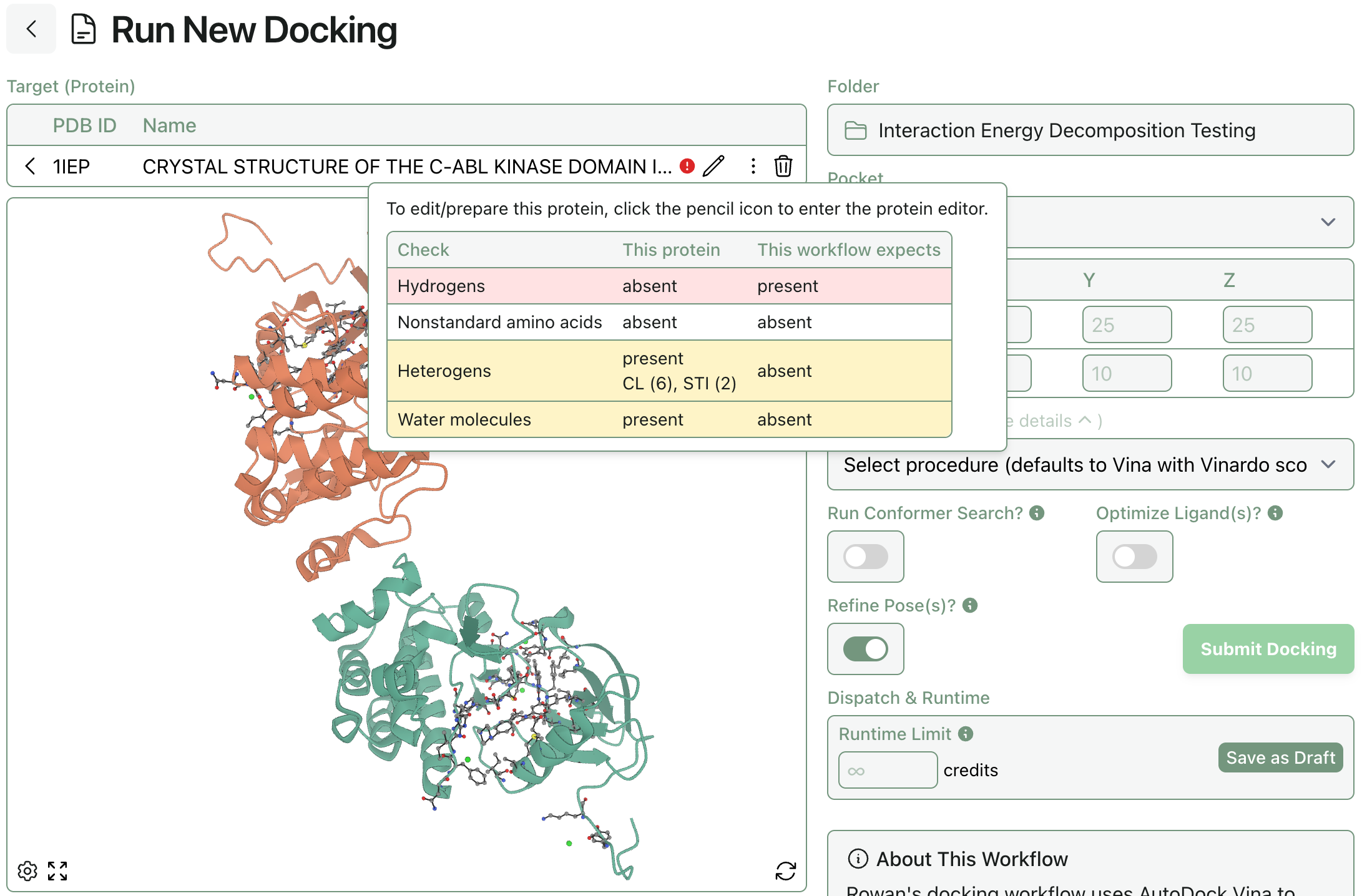 After uploading a protein to any submit page, Rowan will now highlight any discrepancies between the selected protein and what the workflow expects.