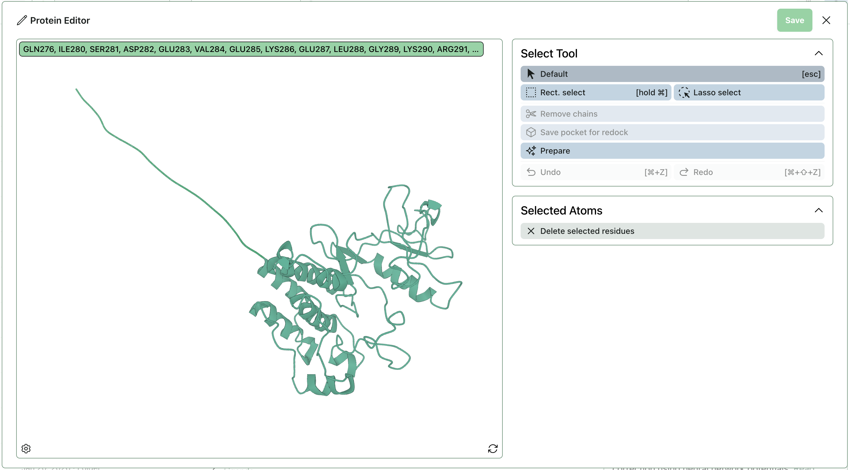 If any unresolved residues are appended as unsightly tails, you can now also remove them if desired using the editor’s “Delete selected residues” tool. (Preparation may need to be re-run afterwards to add any missing hydrogens.)