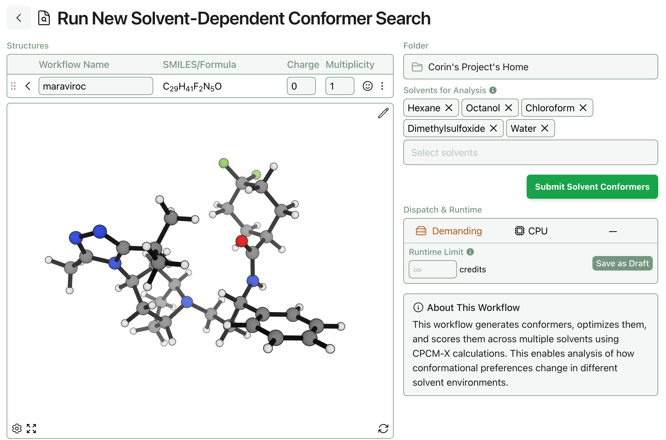 Rowan’s solvent-dependent conformer-search workflow is available to subscribing Rowan users. To run a solvent-dependent conformer search, all you need is a molecule (and which solvents to study, if you want to change the defaults):