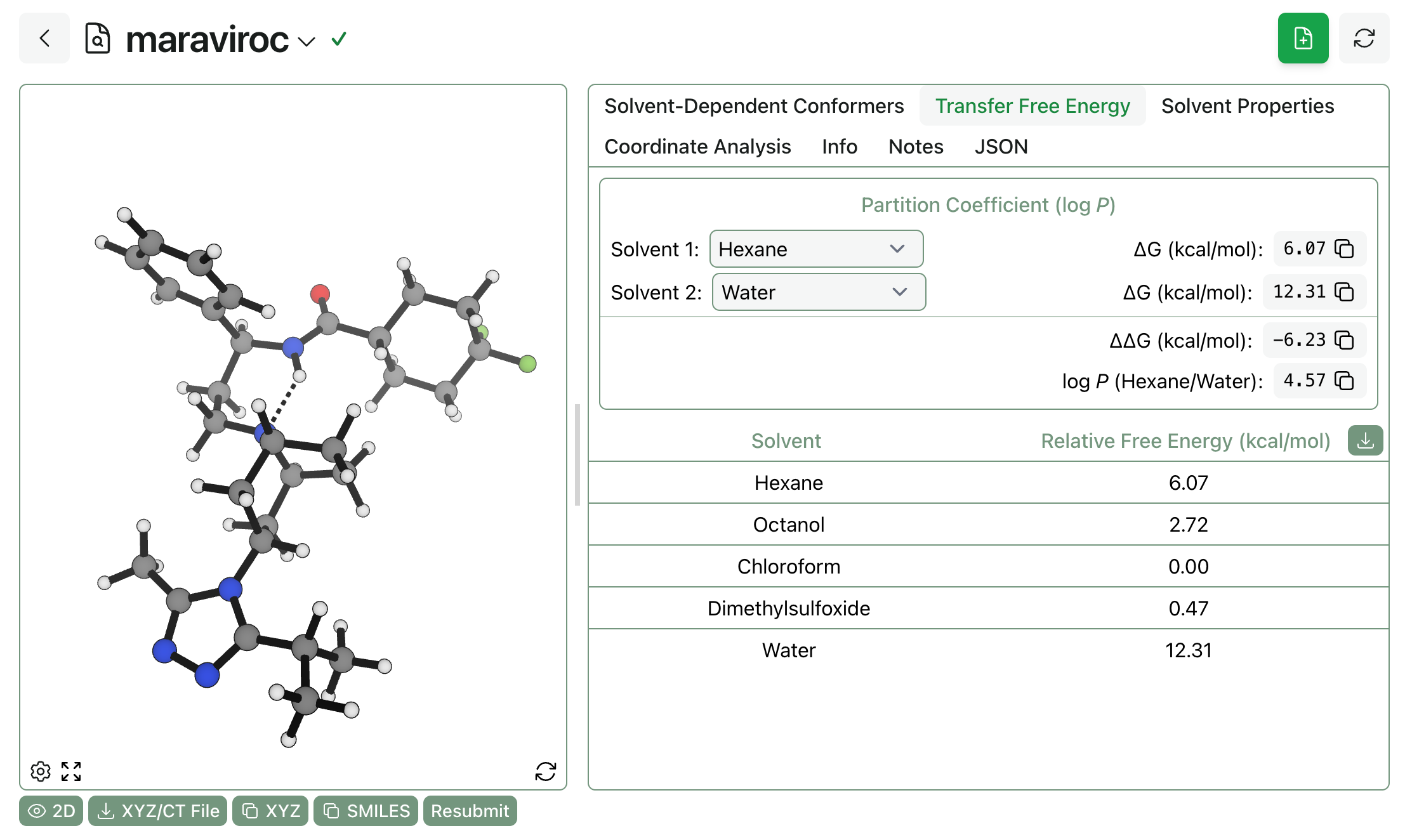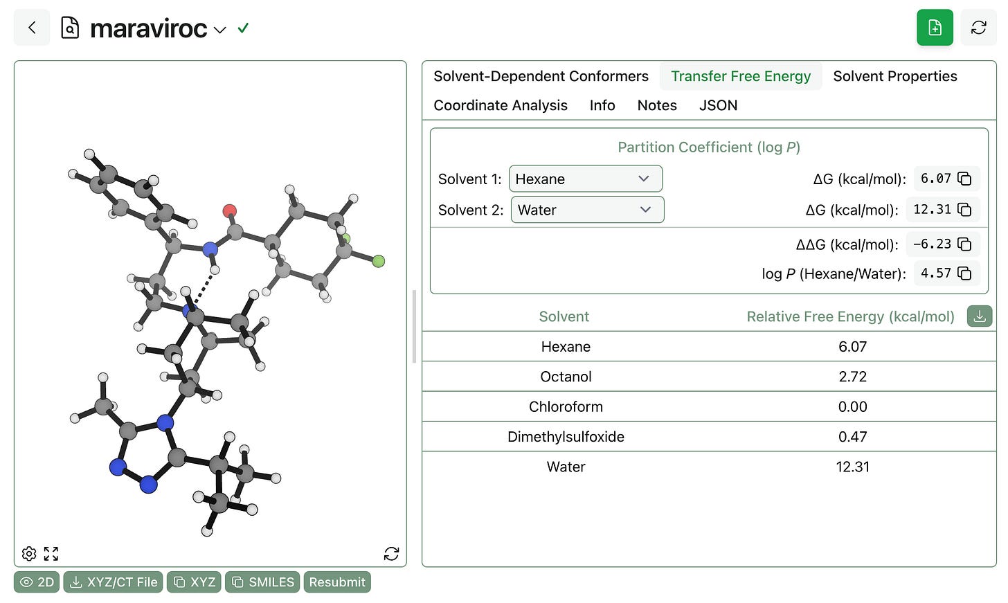 It’s easy to compute transfer free energies and partition coefficients using the workflow’s output. Here, we can see that the logP(hexane/water) is predicted to be 4.57 for maraviroc (which, admittedly, might be protonated under physiological conditions):