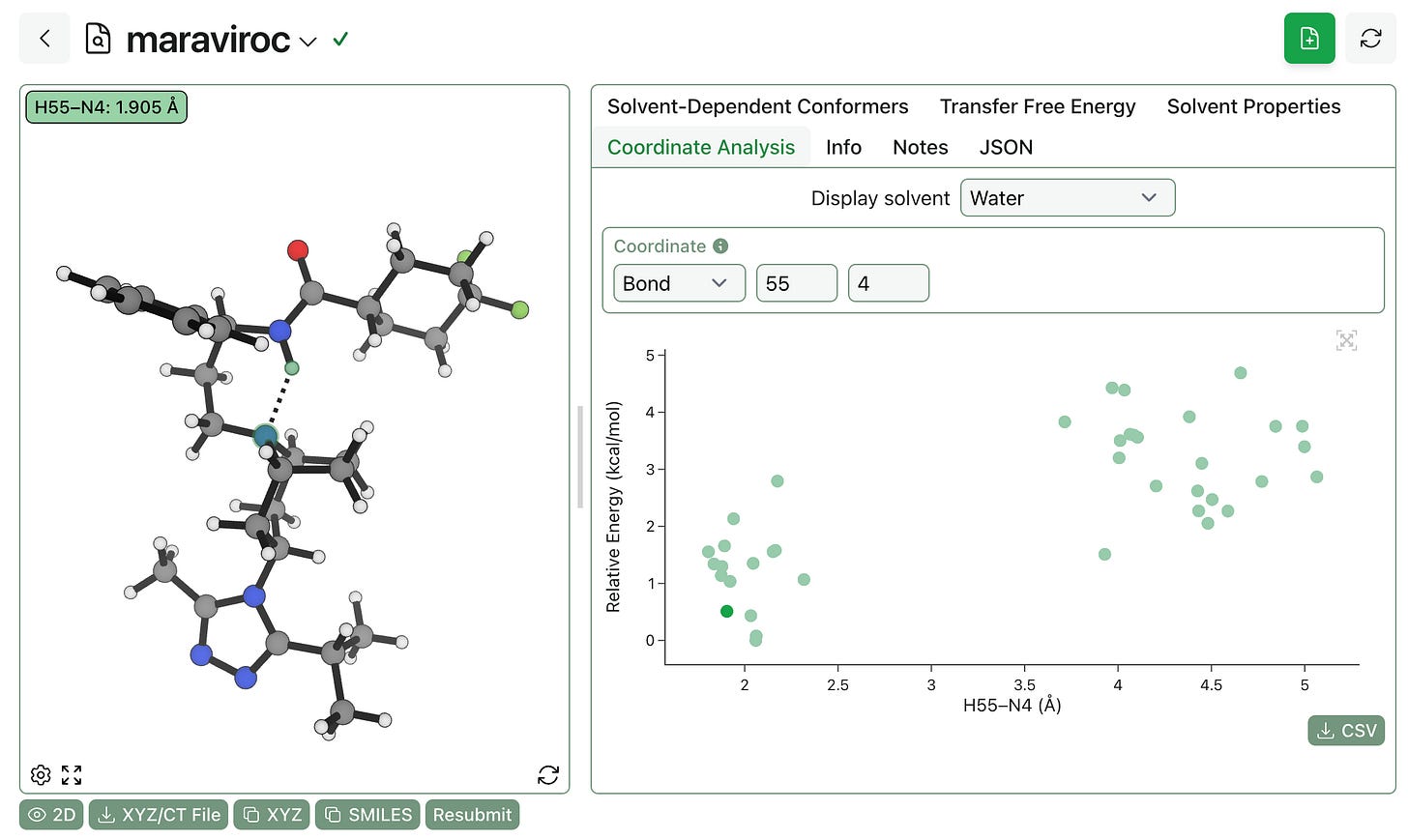You can also visualize how different internal coordinates vary in different ensembles. Displaying conformer energy as a function of the H55–N4 bond distance shows that internal hydrogen bonding is strongly favored even in water: