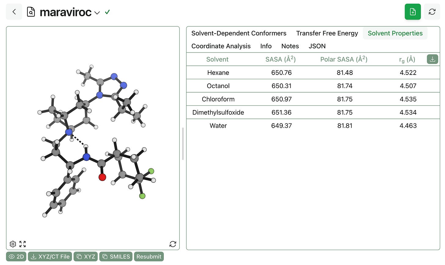 Finally, it’s possible to view the Boltzmann-averaged 3D properties of the entire ensemble. In this case, the strong intramolecular hydrogen bonding observed in all solvents means that maraviroc doesn’t change shape or surface area much across solvents, although it’s worth noting that the aqueous ensemble exposes slightly less total surface area and slightly more polar surface area, as we might expect. (More flexible molecules, like bifunctional degraders, will show bigger differences.)
