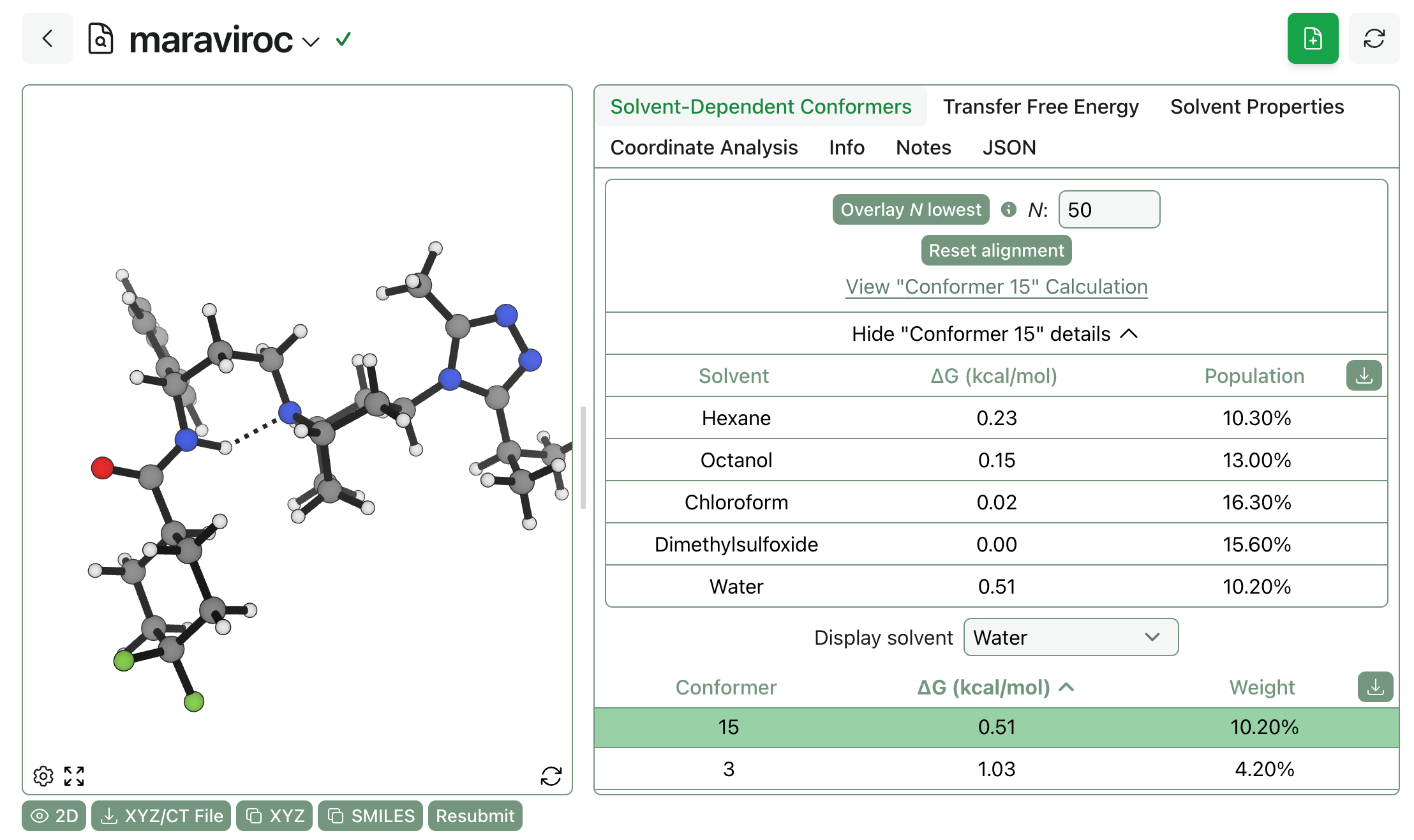 Once the job has finished running, you can see both (1) each conformer’s relative energy and population across all solvents and (2) the ranked list of conformers in each solvent. (You can view this calculation yourself online.)